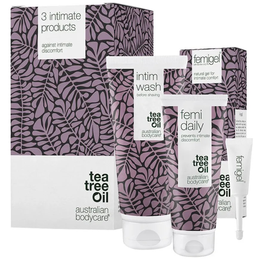 Pakken inneholderIntim Wash, Femigel og Femi Daily som alle inneholder tetreolje som bidrar til å motvirke intime problemer. Intimpleieproduktene motvirker og forebygger kløe, tørrhet og annen irritasjon rundt skjeden og i det øvrige intimområdet.