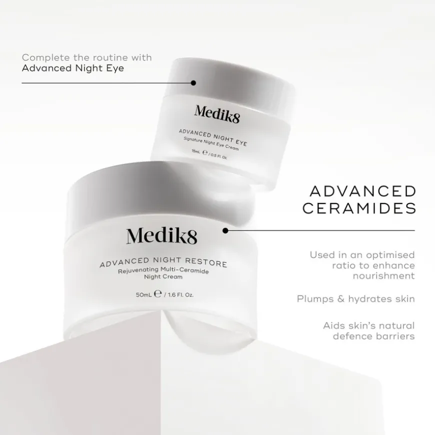 - Ceramidkompleks: viktig for å bevare vann i huden, regulere celleaktiviteten og reparere hudens naturlige beskyttelse. Gir svært effektiv fuktighetstilførsel, men fungerer best i optimal mengde og i kombinasjon med andre molekyler som finnes i hudens naturlige lipidbarriere. Medik8s omfattende forskning på ceramidkombinasjoner har resultert i en optimal kombinasjon av ceramid 1 og 3 samt kolesterol og fettsyrer som i prinsippet er hudidentisk og effektivt tilfører næring til huden.