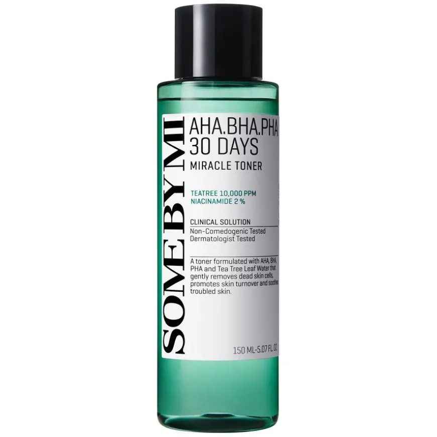 SOME BY MI AHA BHA PHA 30 Days Miracle Toner En toner som har blitt berømt i Sør-Korea og verden over for å berolige akne på bare 30 dager. Tonerens hovedingredienser er AHA, BHA og PHA, som alle bidrar til en glatt og ren hud, fri for urenheter. I tillegg inneholder toneren også tea tree, en ingrediens som reduserer betennelse i urenheter og akne. Påføres med en bomullspad og strykes over huden. Selv om toneren reduserer urenheter på bare 30 dager, varer flasken til langtidsbruk, og toneren kan fortsette å brukes selv etter at urenhetene har forsvunnet for å holde huden sunn og balansert.