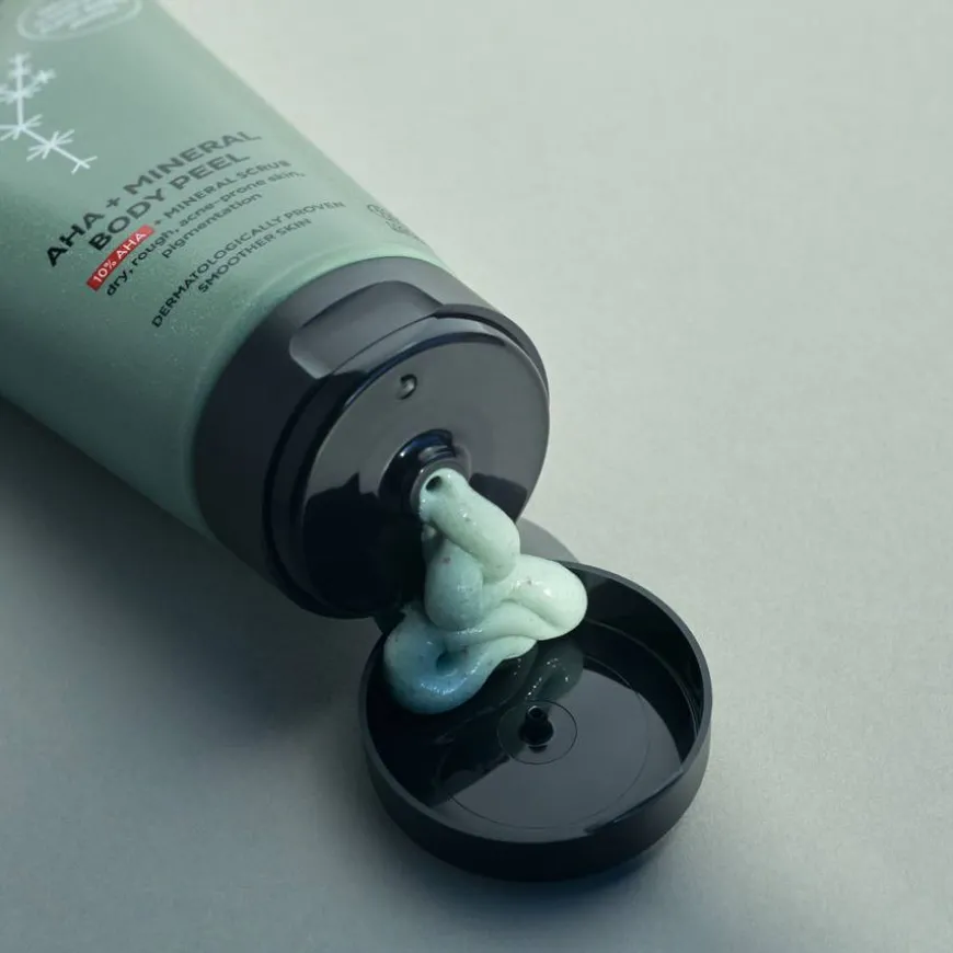AHA+Mineral Body Peel er en sofistikerte kroppspeeling som forener hvit leire med AHA-fruktsyrer og mineralbaserte eksfolierende partikler, og feier bort døde og matte hudceller for å avdekke glattere, klarere hud.