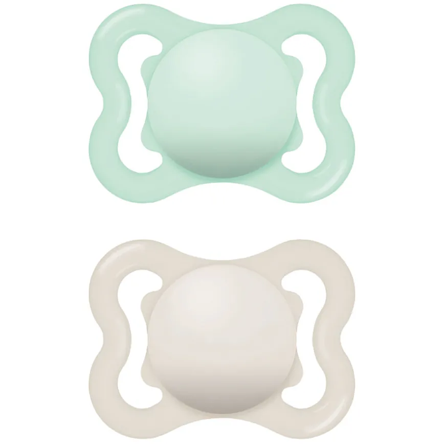 MAM Air har en flat, symmetrisk smokk og ekstra store lufthull slik at babyens følsomme hud kan puste. Den spesielle utformingen gjør også at foreldrene kan se barnets smil, selv når smokken er i bruk. Smokken er laget av silkemyk silikon, MAMSkinSoftTM-silikon som føles myk og velkjent, akkurat som mammas hud, og som godtas av 94 % av babyene*. MAM ønsker det beste for babyen din og planeten vår. Derfor er skjoldet, knoppen og steriliseringsboksen laget av biosirkulære materialer**.