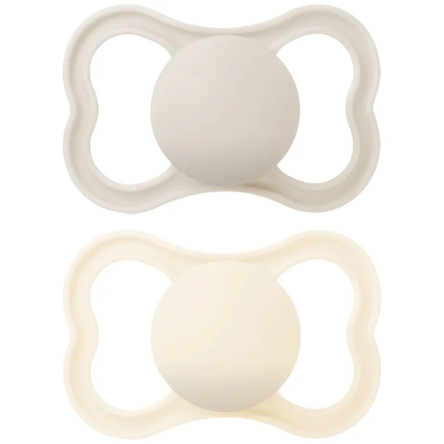 MAM Air har en flat, symmetrisk smokk og ekstra store lufthull slik at babyens følsomme hud kan puste. Den spesielle utformingen gjør også at foreldrene kan se barnets smil, selv når smokken er i bruk. Smokken er laget av silkemyk silikon, MAMSkinSoftTM-silikon som føles myk og velkjent, akkurat som mammas hud, og som godtas av 94 % av babyene*. MAM ønsker det beste for babyen din og planeten vår. Derfor er skjoldet, knoppen og steriliseringsboksen laget av biosirkulære materialer**.