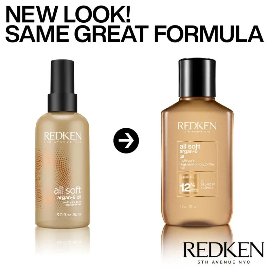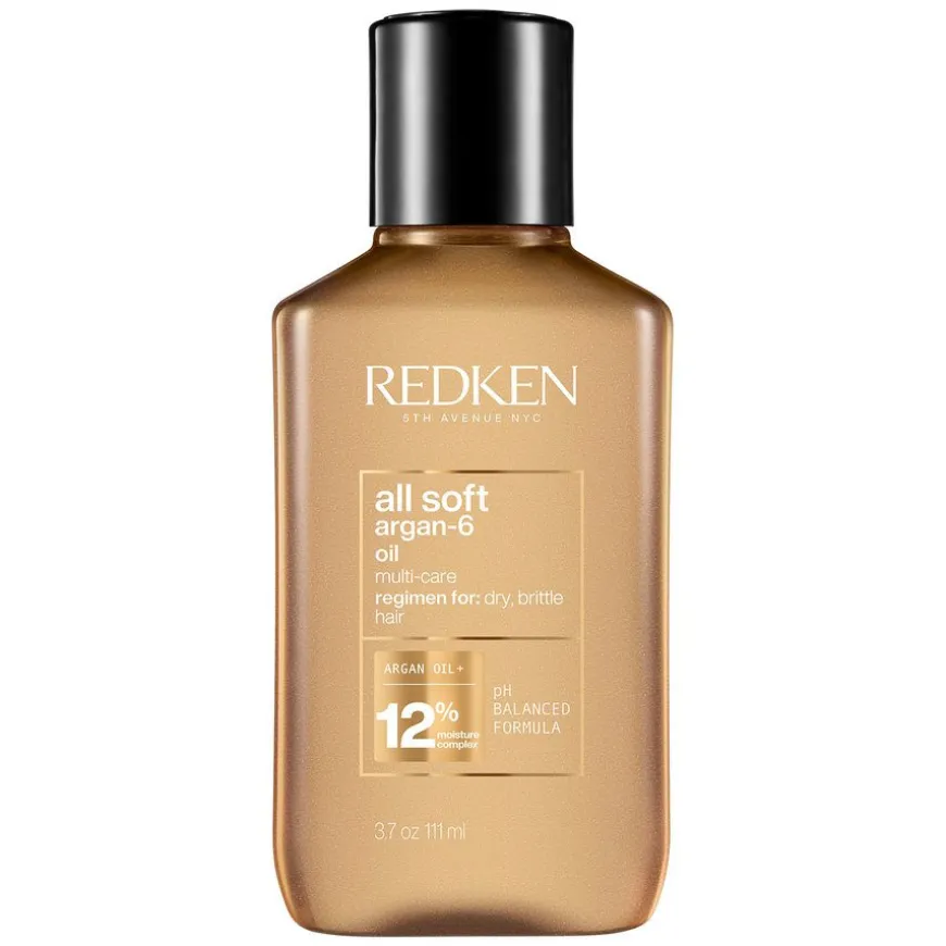 Redken All Soft Argan-6 Oil er en leave-in-hårolje er beriket med omega-6. Den glatter ut håret, pleier tørt hår og tilfører mykhet. Denne håroljen, som er beriket med arganolje og inneholder Redkens Moisture Complex, kan brukes som primer før hårvask eller hårføning for å nære håret, etter hårføningen for å glatte ut håret, i tørt hår for å tilføre glans, eller over natten for å pleie håret i dybden.