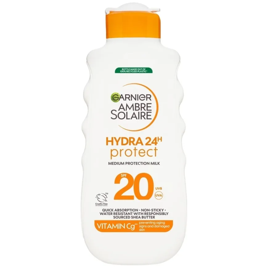 Garnier Ambre Solaire Hydra 24H Protection Milk SPF20 er en solkrem som beskytter mot UVA- og UVB-stråler. Fuktighetsgivende formel som hjelper til å beskytte mot solens uttørkende effekt og bidrar til myk og smidig hud. Filtersystemet hjelper til å beskytte huden mot: UVA: For tidlige aldringstegn samt langvarige skader på huden forårsaket av solens stråler. UVB: Umiddelbare skader på huden forårsaket av solens stråler.