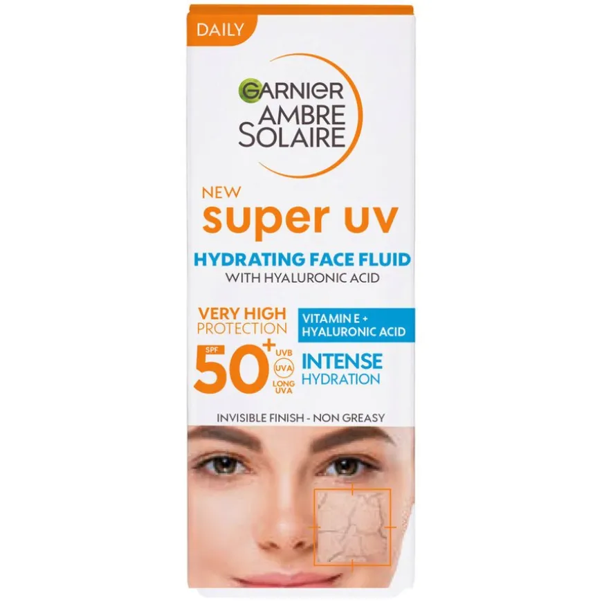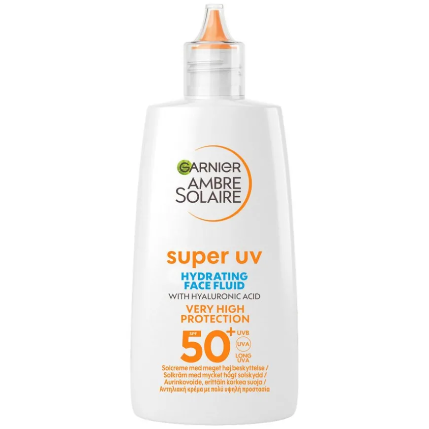 Garnier Ambre Solaire SUPER UV solbeskyttelse til ansiktet med SPF50+. En lett flytende formel som er beriket med E-vitamin og hyaluronsyre. Denne solbeskyttelseskremen beskytter også huden din mot forurensning* og motvirker mørke flekker som forårsakes av solens stråler. Hypoallergen og parfymefri. *Beskytter mot oksidativt stress pga smog.
