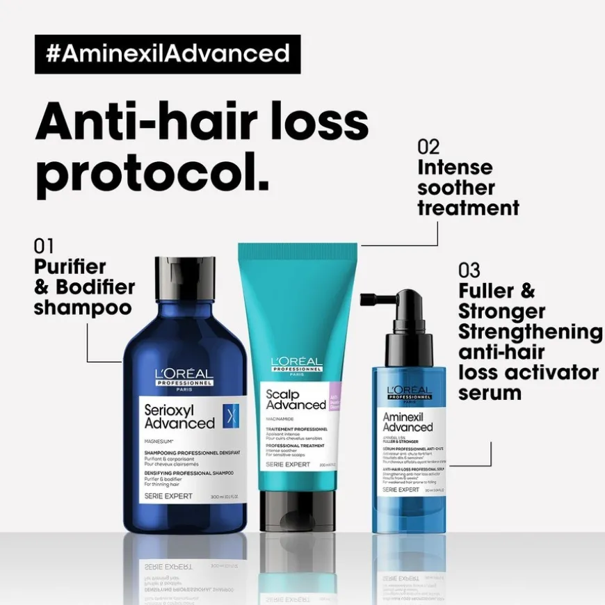 Aminexil Advanced Fuller & Stronger Activator Serum er et serum som er målrettet og formulert for hår med en tendens til å falle av. Dette lette serumet reduserer hårtap og forsterker hårfiberen, for et fyldigere og sterkere hår. Resultater fra 6 uker*. Serumet er konsentrert med 1,5 % Aminexil, for å myke opp kollagen og forsterke rotforankring. Duften er en frisk komposisjon, innhyllet i en forfriskende bris. Serumet er utviklet i samarbeid med profesjonelle og er testet under dermatologisk kontroll.
