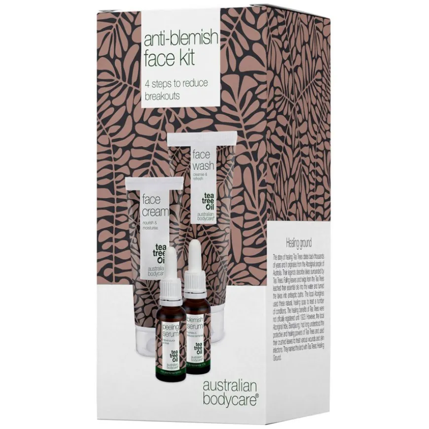 Anti-Blemish Face Kit 4 Steps To Reduce Breakouts er et sett med 4 ansiktsprodukter, som utgjør en enkel og effektiv hudpleierutine hvis du sliter med kviser, hudormer og fet hud. Produktene renser i dybden og etterlater huden glatt, jevn og fri for urenheter. Settet består av 3 daglige renseprodukter, som du bør bruke både morgen og kveld, samt et Peeling Serum, som brukes et par ganger om uken. Produktene er dermatologisk testet og kan brukes av både menn og kvinner i alle aldersgrupper. For å unngå tette porer, kviser og hudormer, er det viktig at du renser huden din både om morgenen og kvelden. Det fjerner overflødig talg fra huden, noe som kan utvikle seg til kviser og talg hvis det blir ignorert. Alle ansiktsproduktene er basert på den naturlige australske ingrediensen, Tea Tree oil, som er kjent for å motvirke bakterier. De bakteriedempende egenskapene til Tea Tree oil hjelper deg redusere antall kviser og hudormer. Utover dette, tilfører Niacinamid Serum gode ingredienser til huden din. Det gjelder både Tea Tree oil, Zink og Niacinamid, som forebygger urenheter og minsker synlighet av porer. Dette gir en pen og glatt hud, fri for kviser. Peeling Serum – som brukes 1-2 ganger i uken – har et høyt innhold av naturlig AHA fruktsyre, som skånsomt fjerner og forebygger ujevnheter og urenheter i huden.