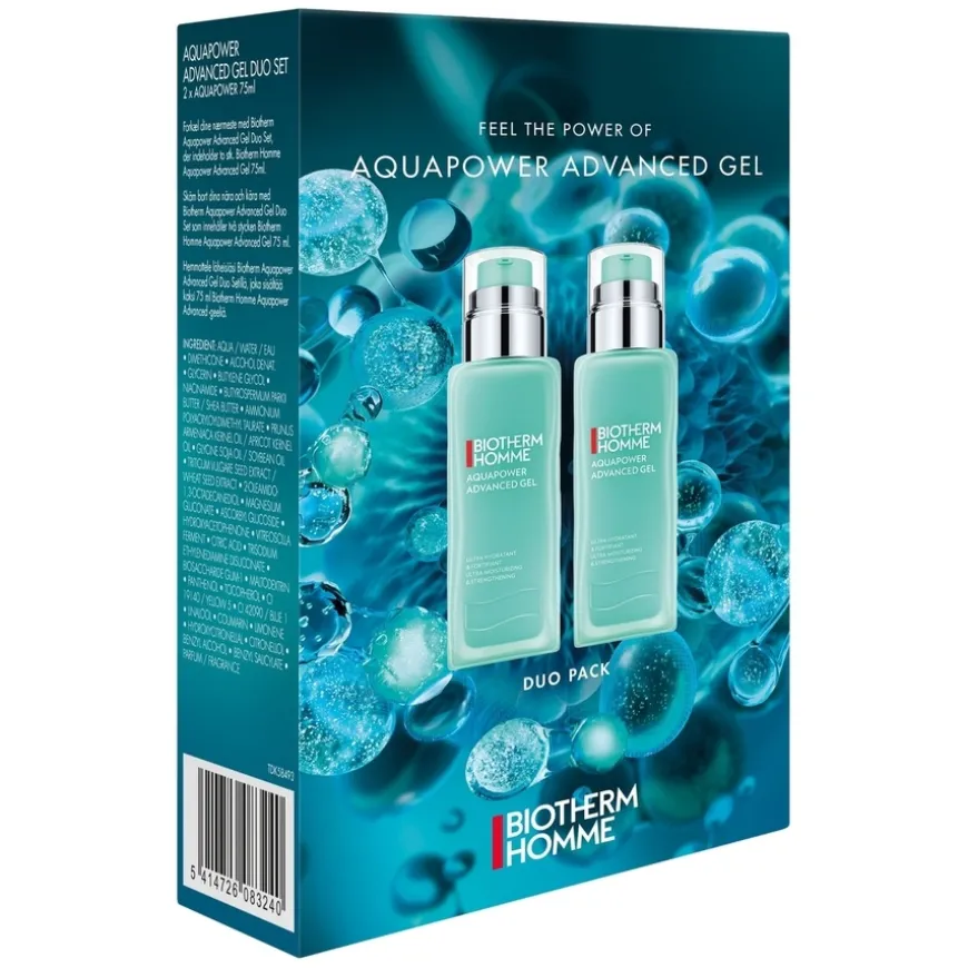 Aquapower Advanced Gel Duo Set inneholder to fuktighetsgivende ansiktsgeler fra Biotherm Homme, spesielt utviklet for menns hud. Den lette vanngeléformelen gir øyeblikkelig og langvarig fuktighet i opptil 48 timer*, uten å etterlate en fet eller klissete følelse. Aquapower Advanced Gel er beriket med Biotech Plankton™, ceramider, vitamin Cg, B3, B5 og E. Den virker oppfriskende og revitaliserende på huden, samtidig som den styrker hudbarrieren og forbedrer hudens motstandskraft. Ideell for en aktiv livsstil og alle hudtyper, gir produktet huden glød, energi og en sunnere fremtoning.