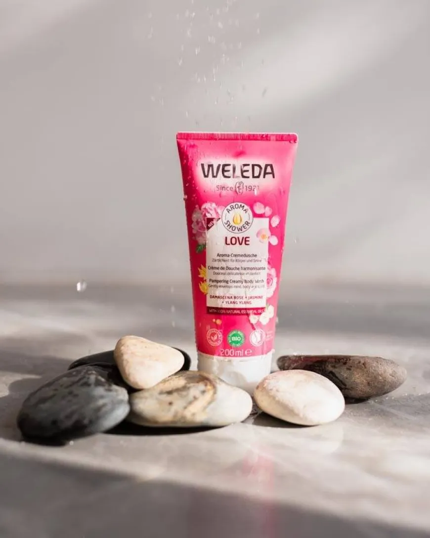Luksuriøs dusjkrem med naturlige ingredienser som pleier huden i kombinasjon med en harmoniserende blomsterduft for sansene. Med naturlige duftnoter av romantisk rose, verdifull jasmin og søt ylang ylang. Renser huden mildt med en base av mykgjørende solsikkeolje og naturlige sukkertensider. Nyt et øyeblikk av «kjærlighet» med Weledas dusjkrem som har 100 % naturlig opprinnelse. Dermatologisk testet.