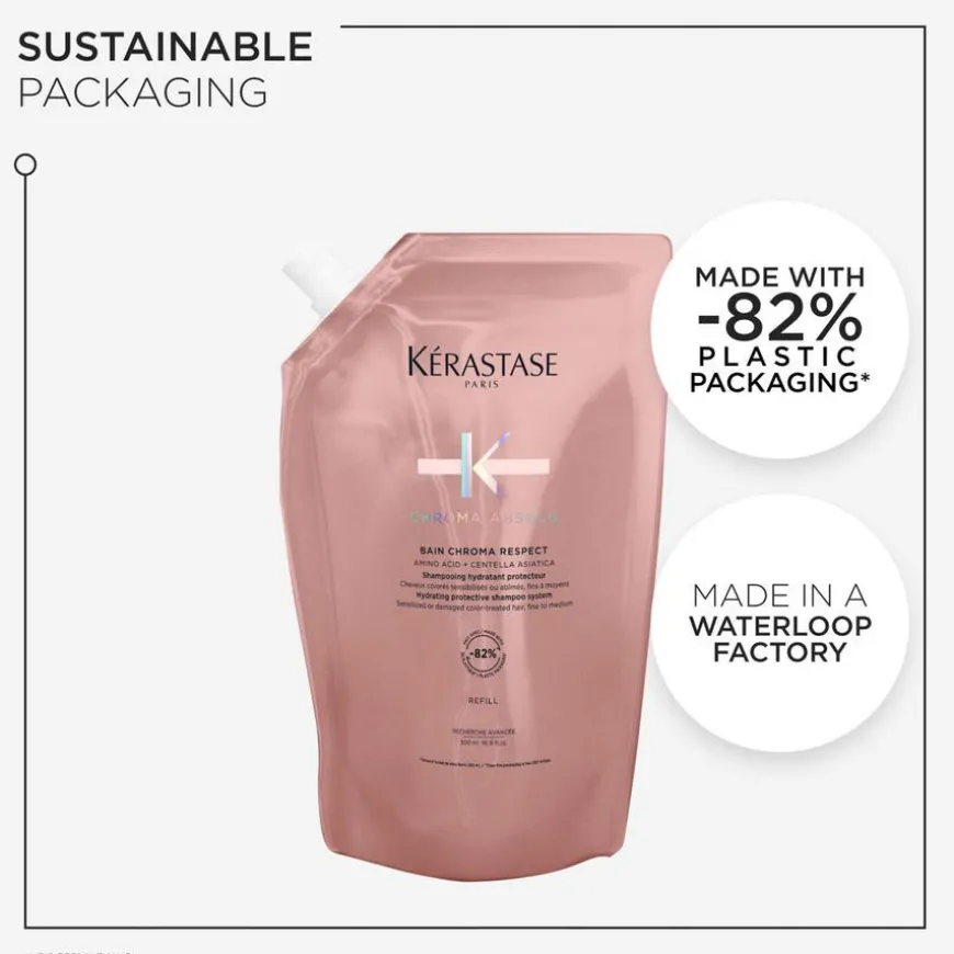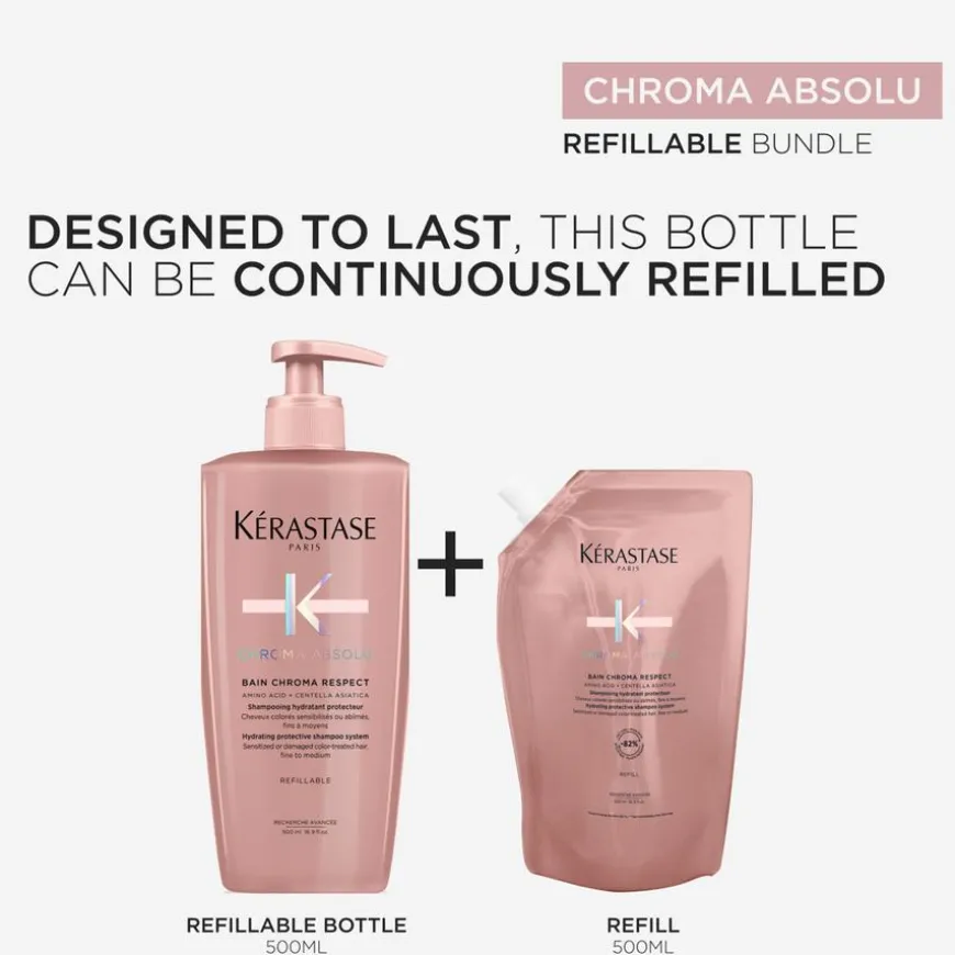 Bain Chroma Respect er en skånsomt fuktighetsgivende, beskyttende shampoo i refill format for alle typer sensibilisert eller skadet, fargebehandlet hår, hovedsakelig tilpasset tynt til middels tykt hår. Denne lyserosa, kremaktige gelkonsistensen, beriket med en kombinasjon av aminosyre og Centella Asiatica, fukter håret samtidig som den styrker fibrene for å beskytte fargen mot å avta eller falme. Refill-posen kan kun brukes sammen med Kérastase sin 500ml shampooflaske.
