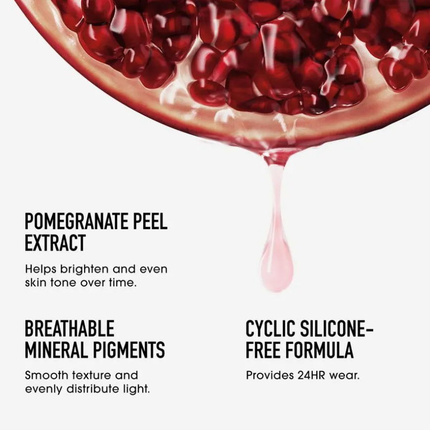 Formulert med lysende perleekstrakt av oppsirkulert granateple og mineralbasert pulver for å jevne ut hudens tone på syv dager*. Den er vektløs på huden og etterlater ingen hvite rester. Inneholder sinkoksid for å beskytte huden mot skadelig UVA, UVB, frie radikaler + infrarødt sollys med bredspektret solfaktor 20. Foundationen er ikke-komedogen og vegansk.