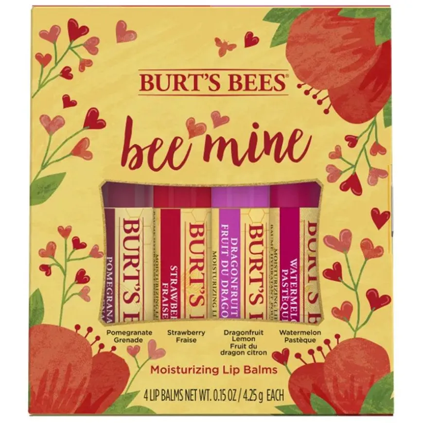 Bee Mine Lip Balm er et gavesett som inneholder fire praktiske tuber med Burt’s Bees naturlig fuktighetsgivende leppebalsam i fire smaker: vannmelon, dragefrukt/sitron, granateple og jordbær.