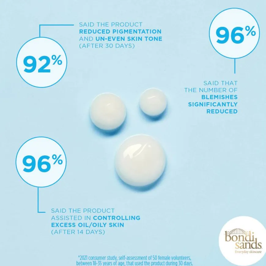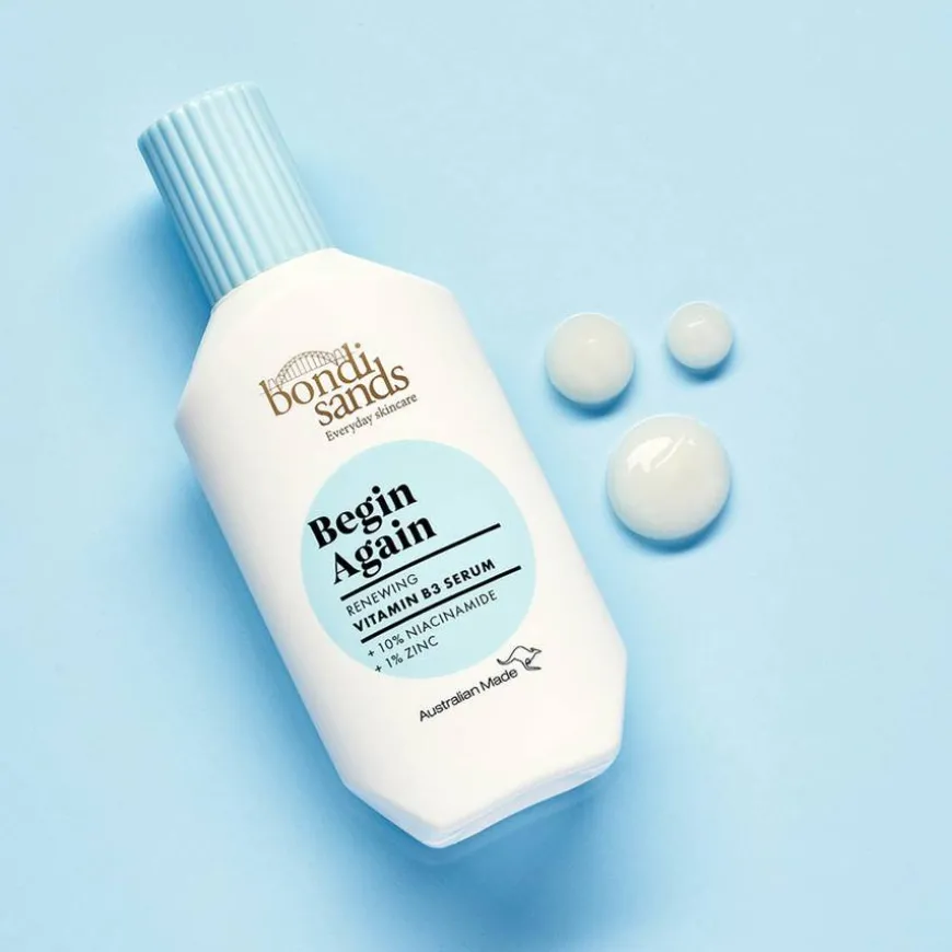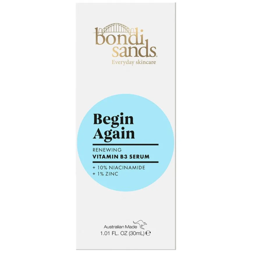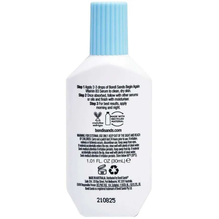 - Påfør 2–3 dråper Bondi Sands Begin Again Vitamin B3 Serum på ren og tørr hud.
