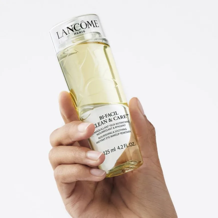 Bi-Facil Clean & Care Eye Makeup Remover er en mild sminkefjerner med en beroligende formel som fjerner øyesminke, til og med vannfast. Og ved ganske enkelt å snu flasken noen ganger aktiveres den unike 2-lags (bi-fase) formelen, som deretter etterlater huden frisk og avkjølt. Øyekonturen næres med fuktighet og øyevippene føles smidige. Sminkefjerneren er beriket med jojoba- og mandelolje og rosevann, som sammen pleier og beroliger øyeområdet. Denne øyesminkefjerneren er også 95 % naturlig i opprinnelse, testet av øyeleger og ideell for ømfintlige øyeområder.