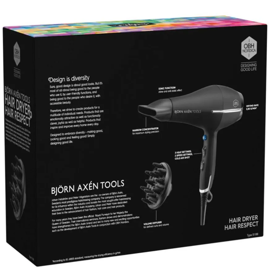 Er du på utkikk etter en kraftig, profesjonell hårføner? Hair Respect fra Björn Axén Tools er utviklet i samarbeid med profesjonelle hårstylister hos Björn Axén, slik at du kan få salongfølelsen i ditt eget hjem. I tillegg til kraftig AC motor har hårføneren en ionisk funksjon, som hindrer statisk elektrisitet og framhever den naturlige glansen i håret ditt.