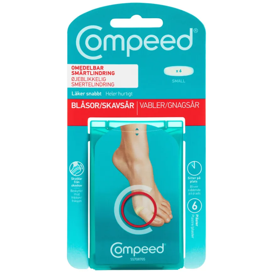 Compeed Blis Small er små gnagsårplaster absorberer overflødig fuktighet og danner en beskyttelsespute som gir umiddelbar smertelindring og optimale forhold for leging av gnagsår på føtter. Compeed gnagsårplaster fungerer som et ekstra hudlag og gir trykkavlastning, smertelindring og beskytter dessuten mot vann, smuss og bakterier. Hydrokolloiden skaper et fuktig sårmiljø, og dette gir best mulige forutsetninger for leging av gnagsår eller vannblemmer. Når eventuell væske fra vannblemmen kommer i kontakt med hydrokolloidplasteret, skapes en gel som gir optimal støtdemping mot friksjon og trykk. Dessuten hindrer plasteret at det dannes sårskorpe, noe som fremskynder legingsprosessen. Plasteret kan brukes i flere dager og løsner av seg selv. Rask trykkavlastning og smertelindring.