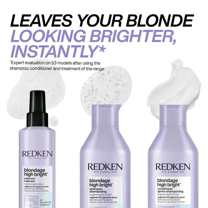 Redken Blondage High Bright Shampoo virker for å klarne, rense og lysne blondt hår som har blitt matt eller matifisert. Få en umiddelbart lysnet effekt* og la håret føles mykt og rent. Som en del av High Bright-rutinen, hjelper denne lysnende shampooen å holde håret glansfullt og velpleiet. Blondage High Bright er formulert med C-vitamin + vårt Brightening Care Complex for å øyeblikkelig lysne!* Perfekt til alle typer farget, stripet eller naturlig blondt hår og holder blondfargen din lys og klar mellom frisørtimer. *Ekspertvurdering på 53 modeller etter bruk av Blondage High Bright sjampo, balsam og behandling.