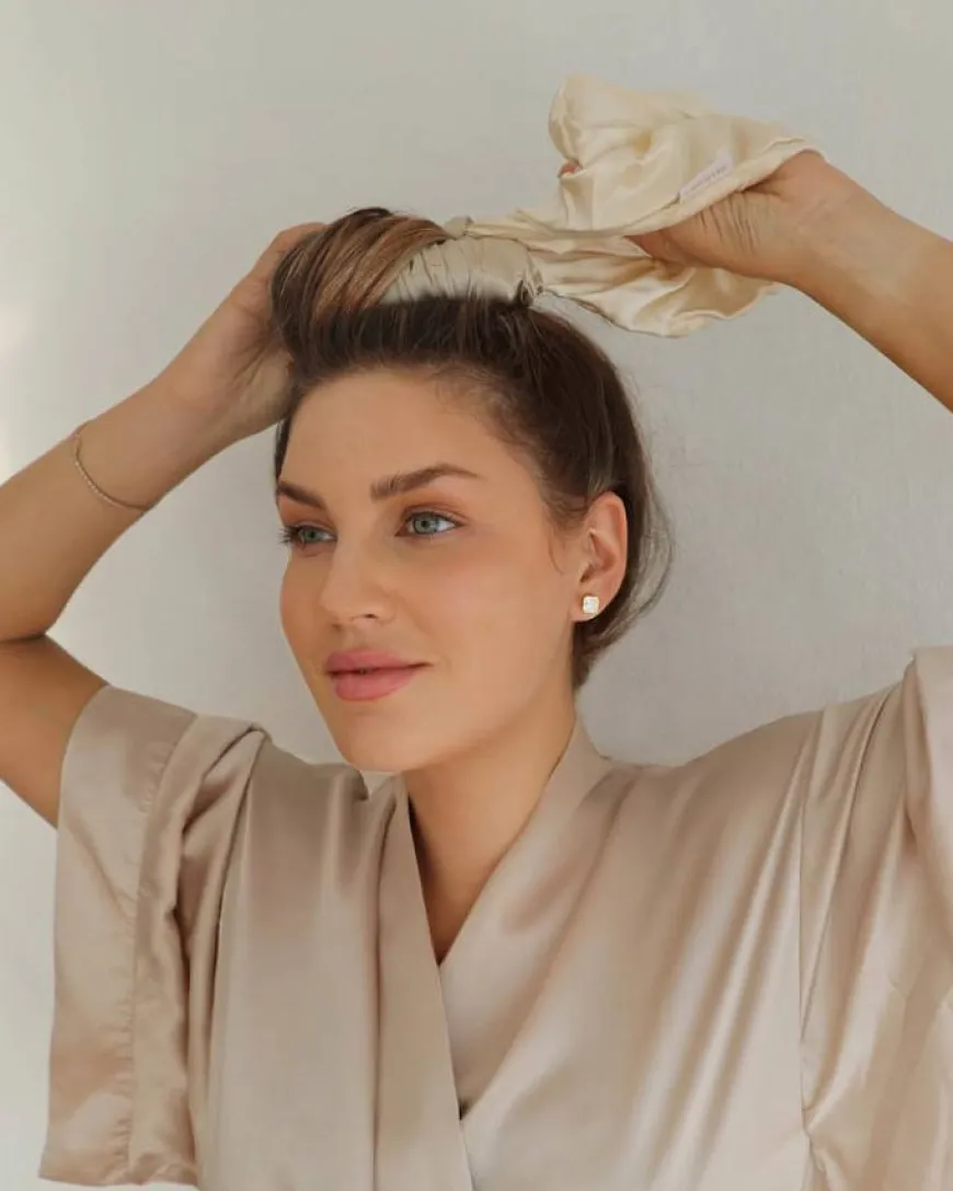 - Grip begge endene av scrunchien og lag en åtteformet bevegelse, som skaper en knute på toppen av hodet.