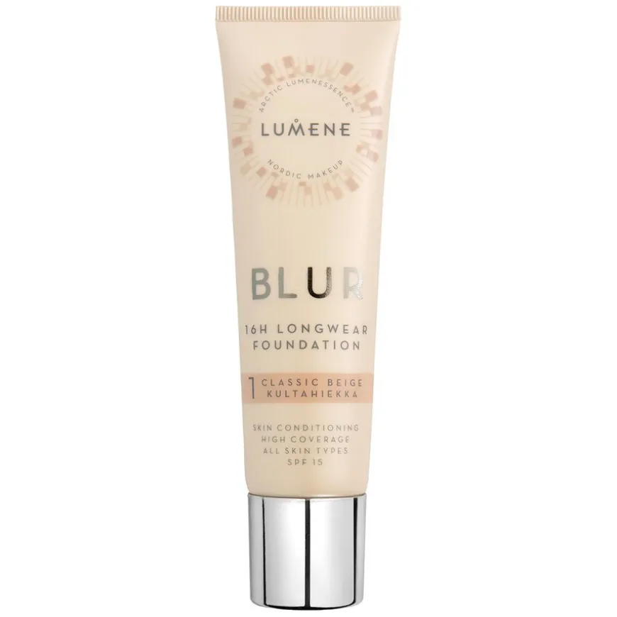 Blur 16h Longwear Foundation er en kremet foundation med høy dekning som skjuler porer og ujevnheter for en feilfri, halvmatt finish som varer i opptil 16 timer. Den mousse-lignende konsistensen er beriket med fuktighetsgivende nordisk kildevann og pleiende nordisk lyng for optimal komfort. Foundationen beskytter huden mot skadelige effekter av UVB-stråling (SPF15). Den er uparfymert og passer til alle hudtyper. 100% vegansk.