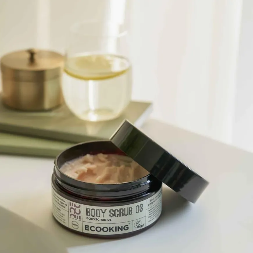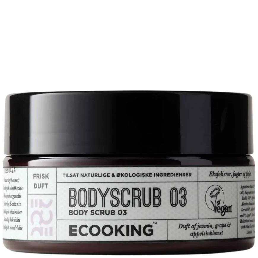 Body Scrub 03 er en vegansk kroppsskrubb som eksfolierer døde hudceller og etterlater huden myk, glatt og sunn. Den inneholder naturlig salt som fjerner tørre og grålige hudlag som ellers hindrer huden i å absorbere fuktighet og pleiestoffer. Med naturlig E-vitamin som beskytter mot frie radikaler og en nærende blanding av økologisk solsikkeolje, arganolje, sheasmør, mandelolje og kukuiolje, får huden intens pleie og beskyttelse. Regelmessig bruk stimulerer blodsirkulasjonen og fremmer hudens fornyelse. Skrubben har en oppfriskende duft av jasmin, grapefrukt og appelsinblomst. Passer for alle hudtyper.