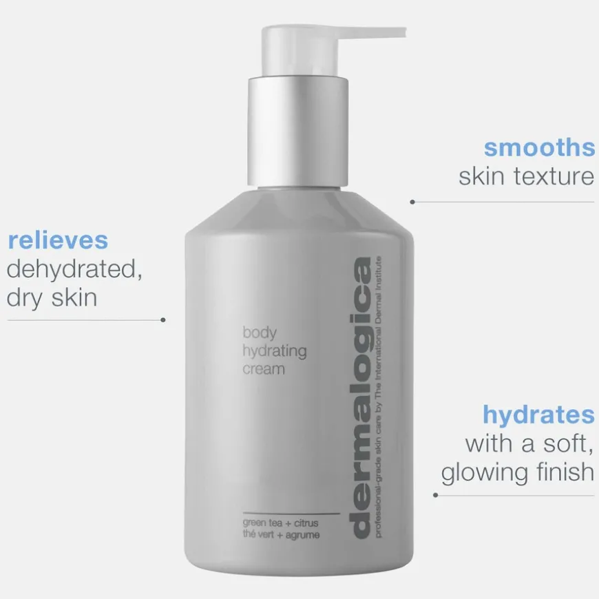 Body Hydrating Cream er en nærende og fuktgivende kroppskrem som inneholder en samling essensielle oljer fra hele verden for en umiddelbar fukt og glød. Fuktighetskremener en del av Dermalogica Body Collection – en serie produkter til kroppspleie som er utviklet for å invitere til øyeblikk med refleksjon og hvile, samtidig som avanserte ingredienser gir resultater på huden. Aromatisk appelsinolje og kinesisk grønn te lindrer og mykgjør huden mens naturlig avledet melkesyre og hydroksisyre mykgjør huden og lindrer tørr hud. Produktet er vegansk og cruelty-free.