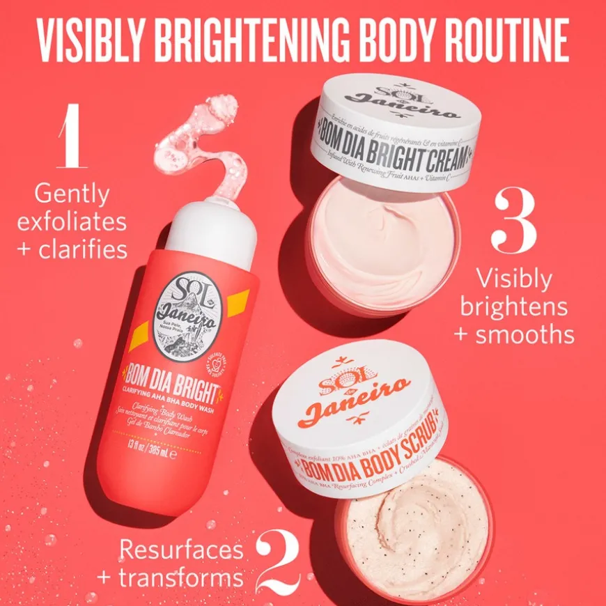 Bom Dia Bright Body Scrub er en fornyende kroppsskrubb som inneholder 10% AHA og BHA for å forbedre hudens klarhet, hudtone og tekstur slik at den blir ren, myk og glødende. De eksfolierende delene kommer fra frøene fra pasjonsfrukten.