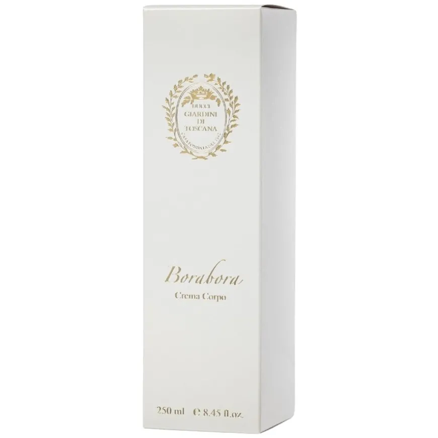 Borabora Body Cream fra Giardini di Toscana er en silkemyk og omsluttende kroppskrem som forsterker den eksotiske vaniljeduften fra Borabora-parfymen. Denne luksuriøse formelen tilfører huden dyp fuktighet og næring, samtidig som den etterlater en forførende duft av tropiske blomster og kremet vanilje.