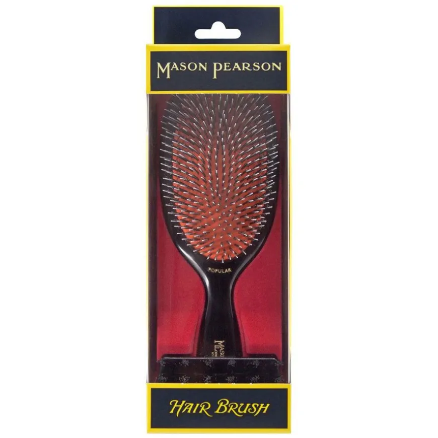 En myk børste som passer perfekt til normalt og tykt hår. Denne hårbørsten rengjør håret, stimulerer hodebunnen og øker blodstrømmen til røttene for å spre hodebunnens naturlige, næringsgivendeolje til hår lengdene og gir styrke, fleksibilitet og en sunn glød. Har et håndtak av celluloseplast som er håndpolert for å være så behagelig som mulig.Myk børste og nylonbørste i toulikelengder og tykkelser.Denne modellen er den mest populære, derav navnet Popular.