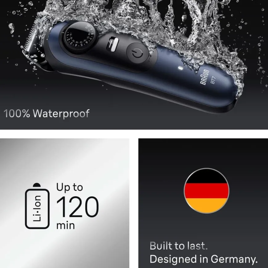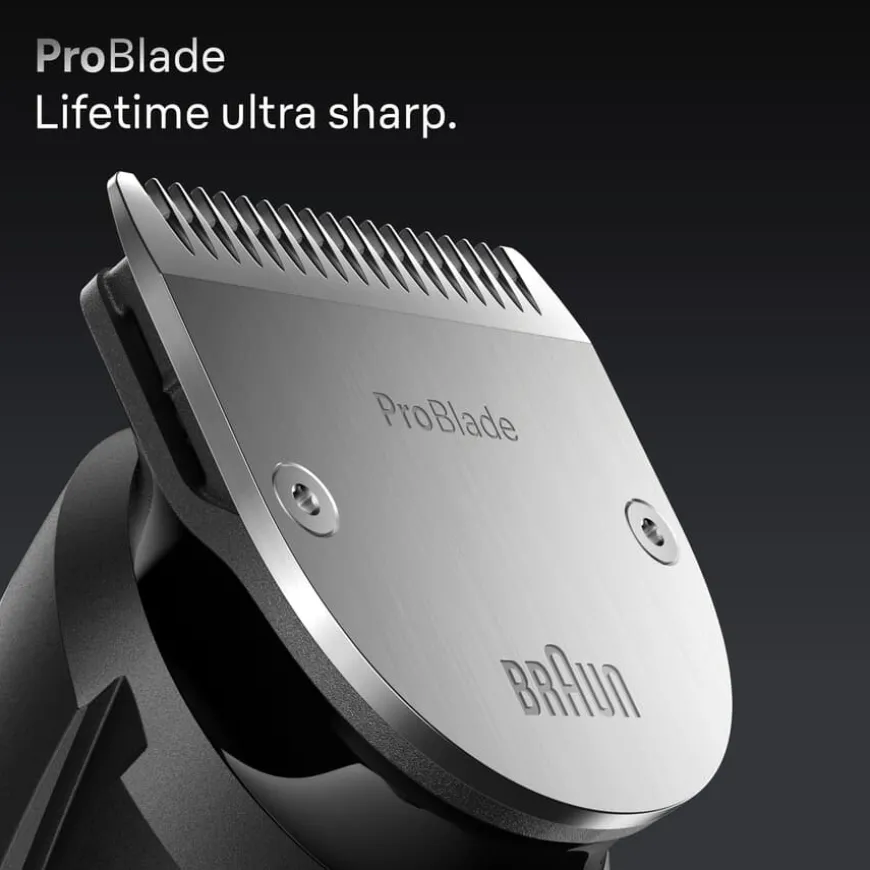 Braun Series 7 skjeggtrimmer er utviklet for profesjonell presisjon og perfeksjon i hvert eneste strøk. Med ultraskarpt ProBlade-blad og AutoSense-teknologi fanger denne trimmeren opp selv de vanskeligste hårene under trimming. Bevar kontrollen med presisjonslås og feilfri styling med 40 lengdeinnstillinger. Med denne trimmeren får du de beste verktøyene for perfekt trimming, barbering, forming av kanter og finisher.