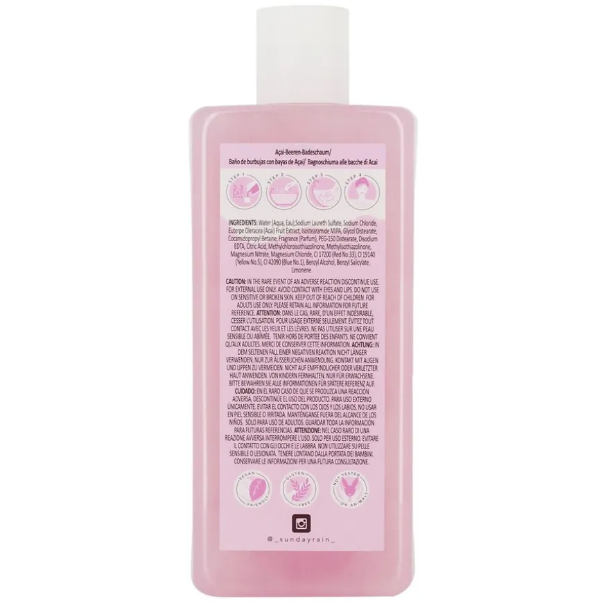 Aqua (Water, Eau), Sodium Laureth Sulfate, Sodium Chloride, Cocamidopropyl Betaine, Phenoxyethanol,Parfum (Fragrance),Isostearamide MIPA, Sodium Benzoate, Glycol Distearate, Disodium EDTA, Cocamide MEA, Butylene Glycol, Euterpe Oleracea Fruit Extract, Laureth-4, Citric Acid, Benzyl Alcohol, Benzyl Salicylate, Limonene, CI 17200 (D&C Red NO.33), CI 42090 (FD&C Blue NO.1), CI 19140 (FD&C Yellow NO.5).