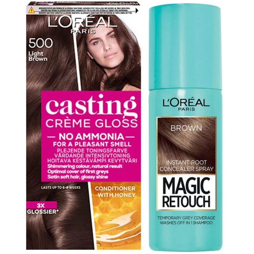 Denne pakken består av to produkter fraL’Oréal Paris:Casting Creme Gloss500 Lys brun og Magic Retouch Brown Spray 75ml. Disse fantastiske hårproduktene benyttes for å skjule ettervekst og/eller for å dekke over grått hår.