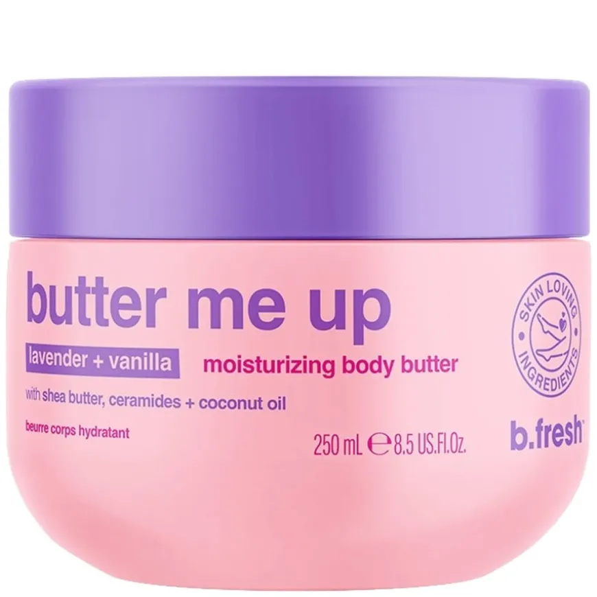 Butter Me Up Moisturizing Body Butter er en rik body butter som gir intensiv fukt og forbedrer hudens tekstur. Den er beriket med nærende sheasmør som låser inn fukt og mykgjør huden, mens ceramider og kokosolje tilfører næring og hjelper med å jevne ut hudtonen. Den fyldige konsistensen smelter inn i huden og etterlater den silkemyk, jevn og velpleid. Duften av lavendel og vanilje gir en beroligende og avslappende opplevelse. Passer for alle hudtyper, særlig tørr og gusten hud som trenger ekstra pleie. 100% vegansk og fri for parabener og sulfater.
