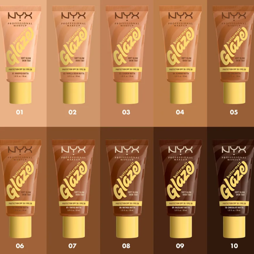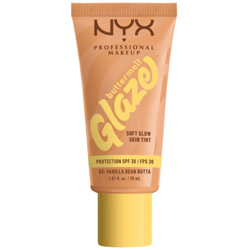 NYX Professional Makeup Buttermelt Glaze Foundation som er beriket med sheasmør, mangosmør og niacinamid. Herlig formel som gir fantastisk glød og en deilig og myk hud. I tillegg har produktet SPF30!