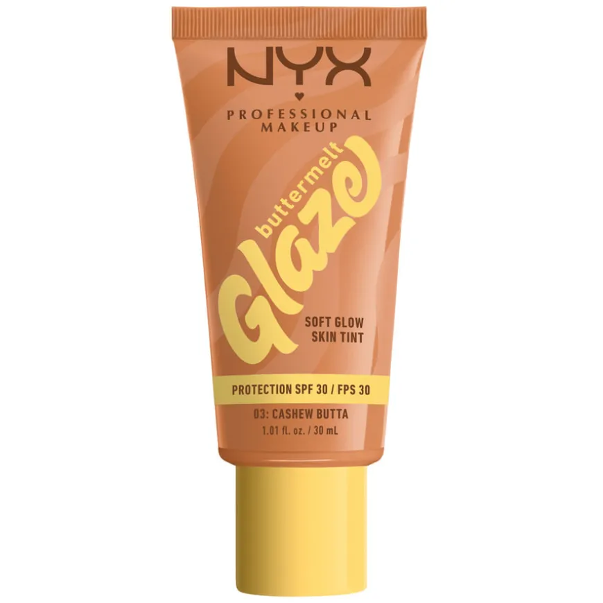 NYX Professional Makeup Buttermelt Glaze Foundation som er beriket med sheasmør, mangosmør og niacinamid. Herlig formel som gir fantastisk glød og en deilig og myk hud. I tillegg har produktet SPF30!