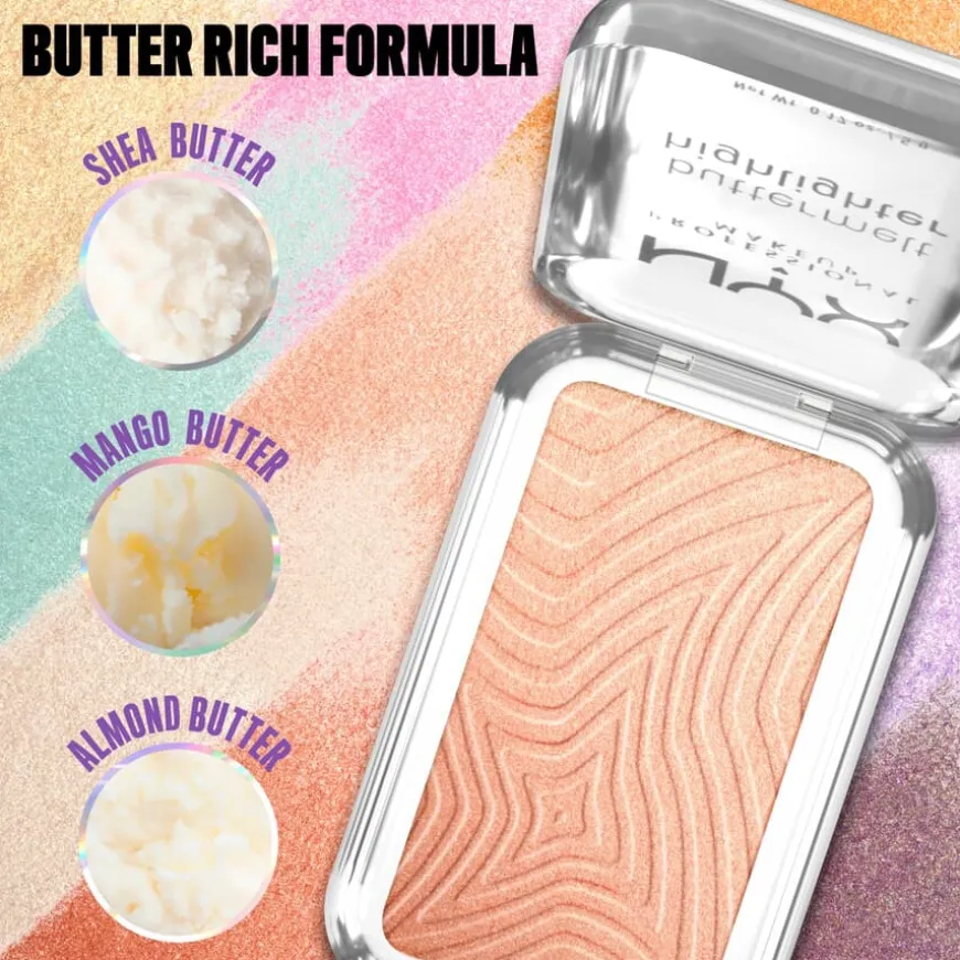 NYX PROFESSIONAL MAKEUP Buttermelt Highlighter er en glødgivende highlighter med en smørmyk formel som smelter inn i huden for en sømløs, strålende finish. Formelen er byggbar, slik at du kan skape alt fra en subtil glød til en intens highlight. Beriket med mango-, shea- og mandelsmør, som gir en kremet følelse og gjør påføringen enkel. Highlighteren sitter i opptil 12 timer, smitter ikke av og blekner ikke i løpet av dagen.