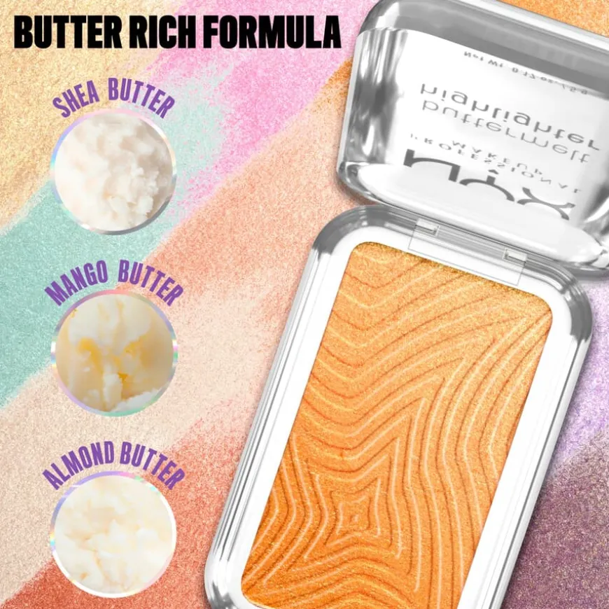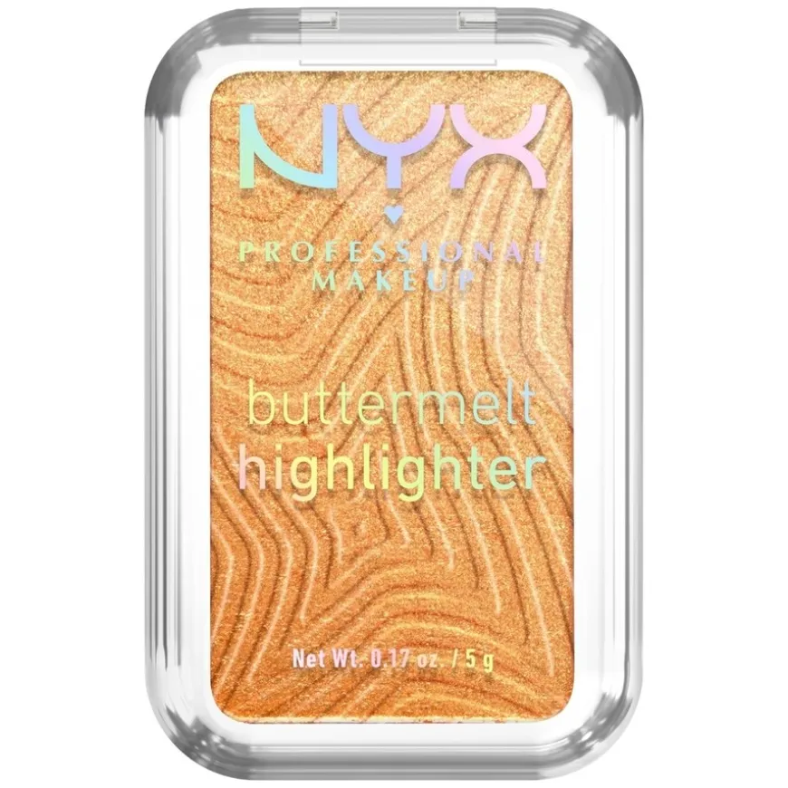 NYX PROFESSIONAL MAKEUP Buttermelt Highlighter er en glødgivende highlighter med en smørmyk formel som smelter inn i huden for en sømløs, strålende finish. Formelen er byggbar, slik at du kan skape alt fra en subtil glød til en intens highlight. Beriket med mango-, shea- og mandelsmør, som gir en kremet følelse og gjør påføringen enkel. Highlighteren sitter i opptil 12 timer, smitter ikke av og blekner ikke i løpet av dagen.