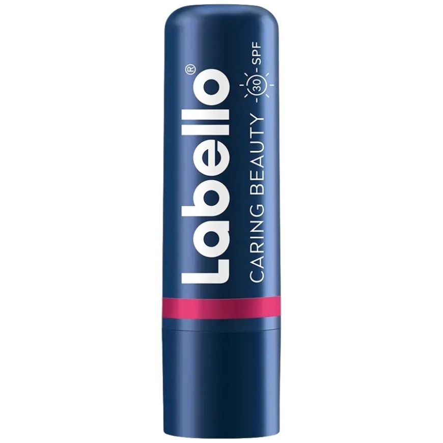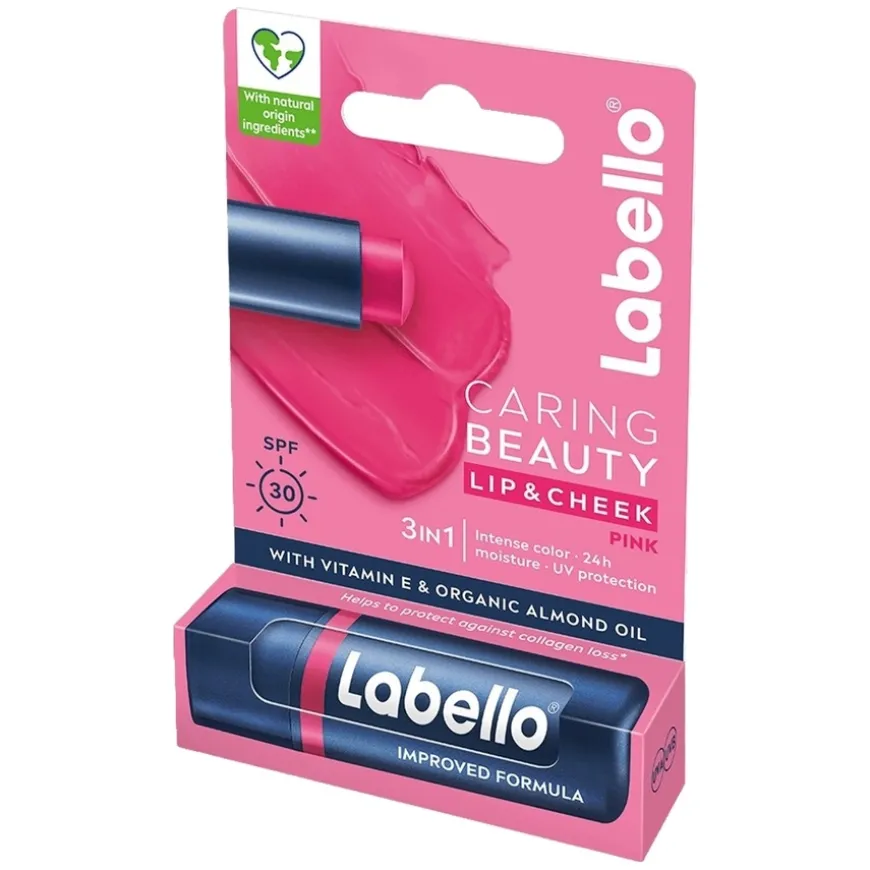 Labello Caring Beauty Pink er en 3-i-1 leppe- og kinnbalsam som kombinerer farge, pleie og solbeskyttelse i én kremet formel. Den gir en intens rosa nyanse med byggbar dekning, samtidig som den tilfører 24 timers fuktighetspleie for myke og glatte lepper. Beriket med økologisk mandelolje og vitamin E, gir den næring og beskyttelse, mens SPF30 bidrar til å forebygge kollagentap forårsaket av UV-stråling. Den lette, kremete teksturen gjør den enkel å påføre både på lepper og kinn, og den kan kombineres med andre farger fra Caring Beauty-serien for en unik nyanse.