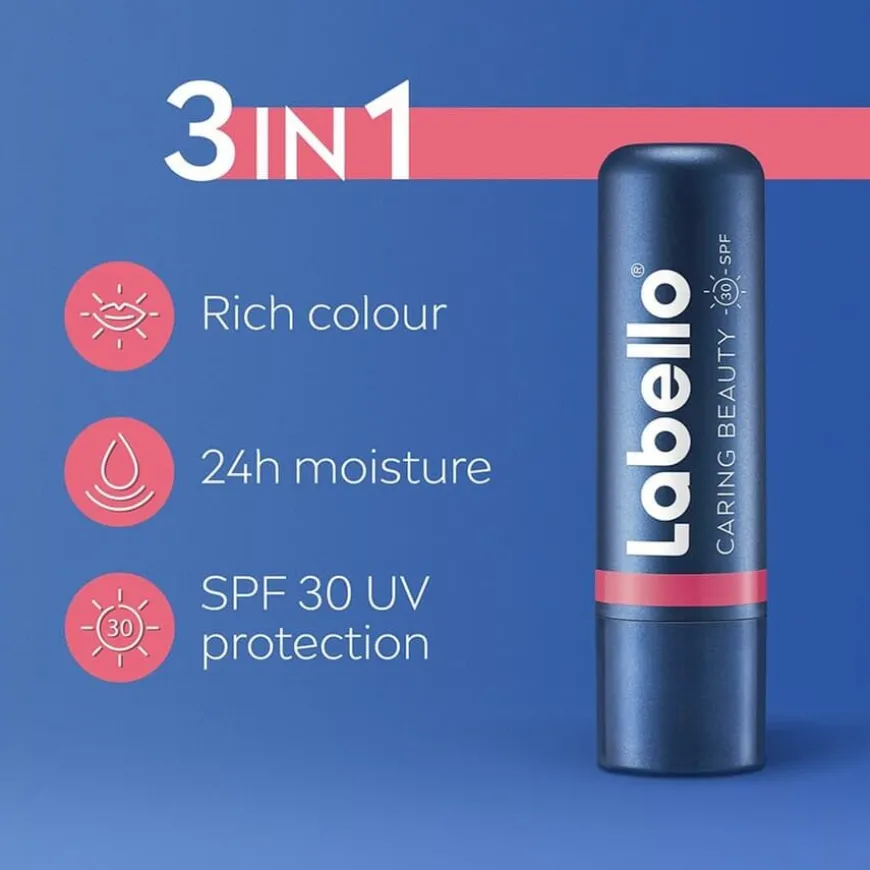 Labello Caring Beauty Rose-Nude er en 3-i-1 leppe- og kinnbalsam som kombinerer farge, fuktighet og solbeskyttelse i én kremet formula. Den gir en intens dus rosa farge som kan bygges opp for en mer markert effekt, samtidig som den gir 24 timers fuktighetspleie for myke og glatte lepper. Formelen er beriket med økologisk mandelolje og vitamin E, kjent for sine pleiende egenskaper, og har en SPF30 som beskytter mot kollagentap forårsaket av UV-stråling. Den kremete teksturen glir lett over huden og er perfekt for både lepper og kinn. Den nye Caring Beauty-serien finnes i flere nyanser, som også kan kombineres for å skape unike fargetoner. Dermatologisk testet og egnet for alle hudtyper.