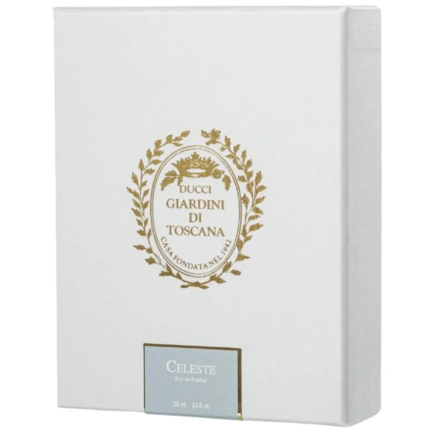 Celeste Eau de Parfum fra Giardini di Toscana fanger essensen av en lys morgen etter en nattlig storm, der frisk luft og en klar himmel skaper en følelse av renhet og ro. Denne unisexduften kombinerer delikate sitrusnoter med florale hint av fiolett iris, noe som resulterer i en krystallklar og ren atmosfære.