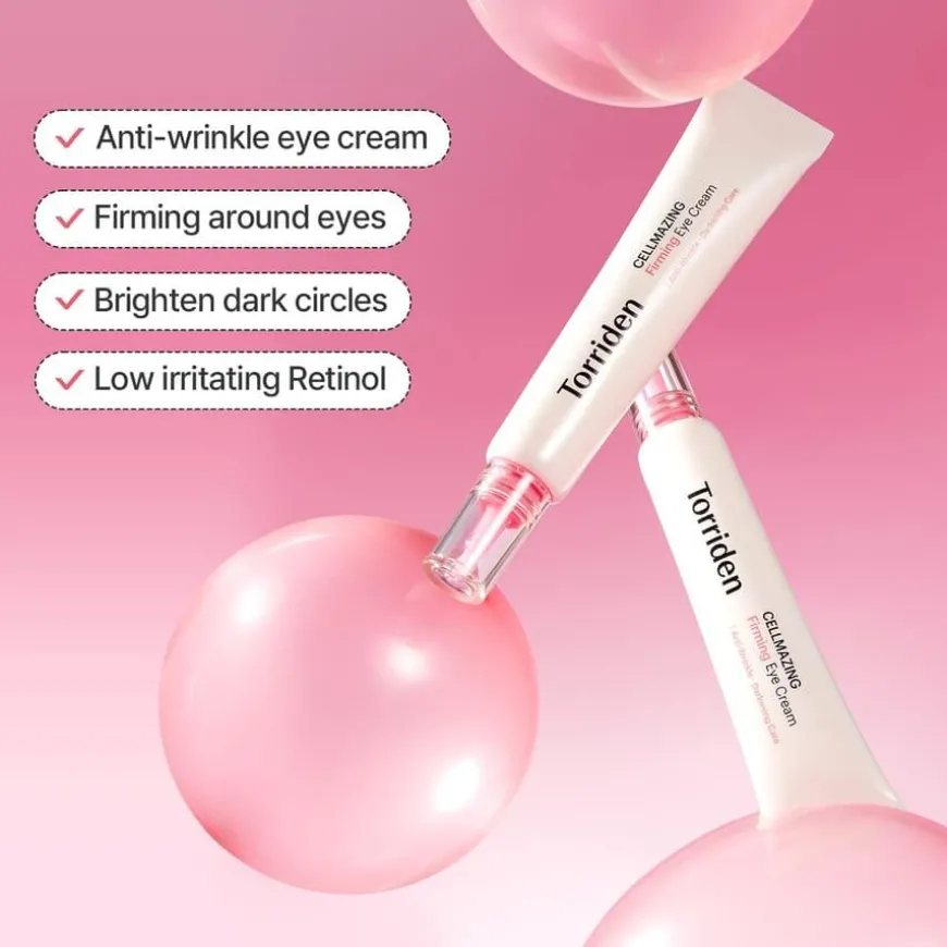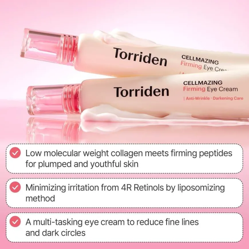 CELLMAZING Firming Eye Cream gir målrettet anti-aldringspleie for de ømfintlige områdene rundt øynene. Beriket med fem ulike størrelser av vegansk kollagen og peptider, bidrar den til å effektivt redusere rynker og mørke ringer under øynene. Med en kombinasjon av ren retinol, retinal og retinolderivater, tilført gjennom hydro-liposomteknologi, hjelper den med å oppnå en jevnere og fastere hud. Kliniske tester viser at øyekremen reduserer synligheten av rynker rundt øynene og smilerynker. Formuleringen inneholder også niacinamid, adenosin, panthenol og hyaluronsyre for å øke hudens elastisitet og fuktighet. Den lette, hurtigabsorberende teksturen etterlater huden myk, komfortabel og med en frisk glød.
