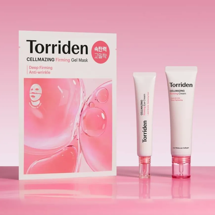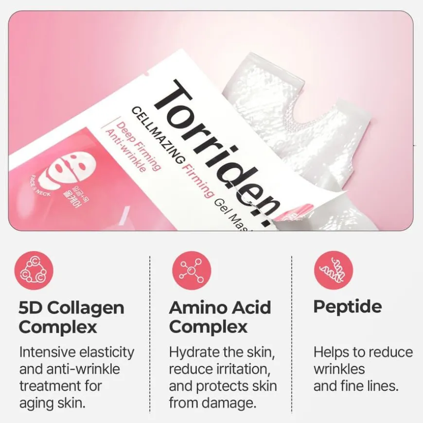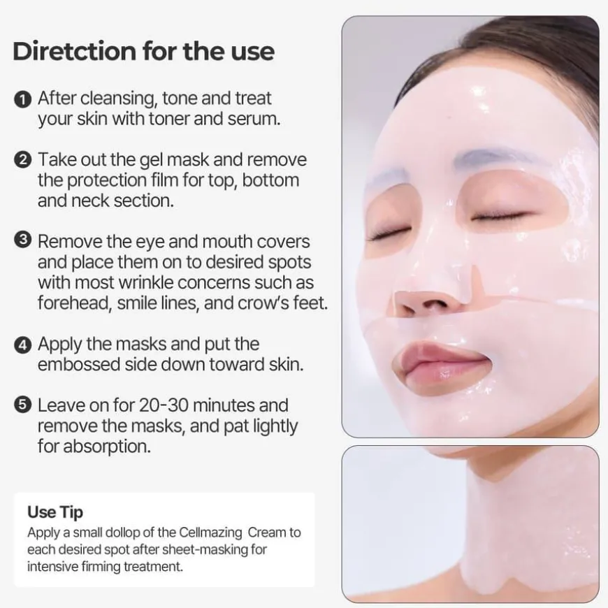 CELLMAZING Firming Gel Mask revitaliserer huden umiddelbart, og gjør den friskere og mer ungdommelig ved å minimere fremkomst av fine linjer, aldringstegn og slapphet. Denne avanserte formelen inneholder en kraftfull blanding av 5 typer vegansk kollagen, 10 typer hyaluronsyre, aminosyrekompleks og peptider som gir beroligende og hydrerende pleie for en glødende, fyldig hud på bare 30 minutter. Kliniske tester har vist at masken effektivt bidrar til å redusere synligheten av rynker og fine linjer. Den innovative gelmasken består av tre deler for optimal dekning av områdene som er utsatt for aldringstegn, fra pannen til halsen.