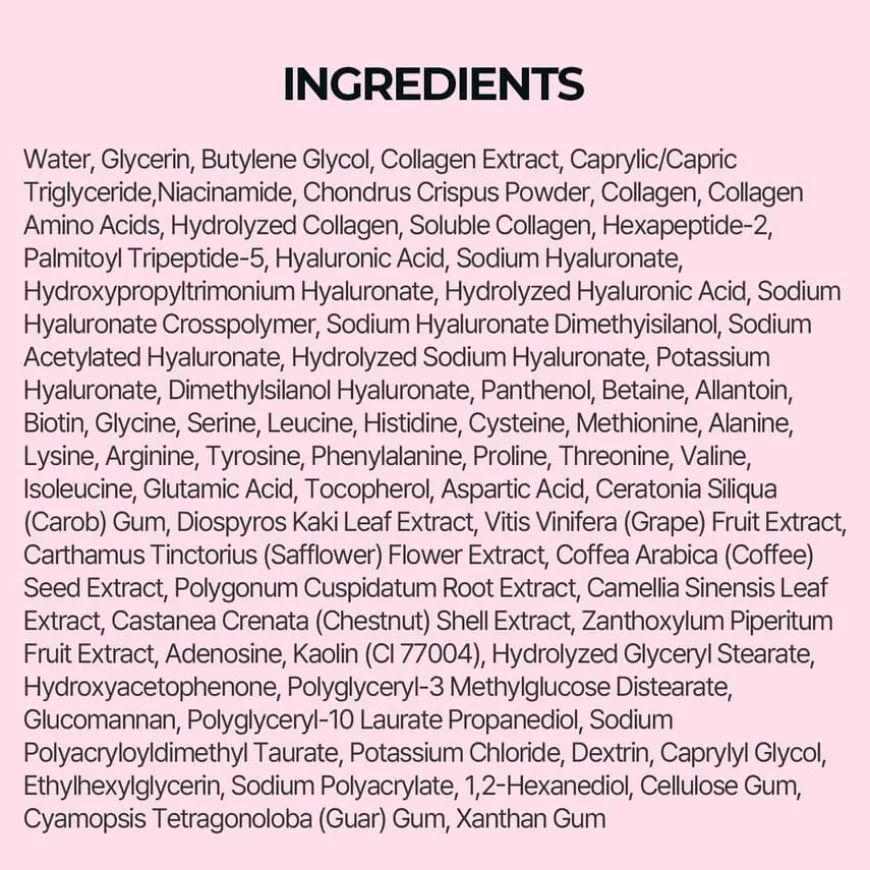 | Aqua, Glycerin, Butylene Glycol, Niacinamide, Caprylic/Capric Triglyceride, Chondrus Crispus Powder, 1,2-Hexanediol, Ceratonia Siliqua Gum, Hydroxyacetophenone, Allantoin, Polyglyceryl-3 Methylglucose Distearate, Xanthan Gum, Panthenol, Polyglyceryl-10 Laurate, Propanediol, Potassium Chloride, Betaine, Glucomannan, Glyceryl Stearate, Sodium Polyacryloyldimethyl Taurate, Caprylyl Glycol, Cellulose Gum, Dextrin, Cyamopsis Tetragonoloba Gum, Adenosine, Ethylhexylglycerin, Sodium Polyacrylate, Collagen, Collagen Amino Acids, Collagen Extract, Hydrolyzed Collagen, Soluble Collagen, Hexapeptide-2, Biotin, Diospyros Kaki Leaf Extract, Vitis Vinifera Fruit Extract, Carthamus Tinctorius Flower Extract, Coffea Arabica Seed Extract, Polygonum Cuspidatum Root Extract, Camellia Sinensis Leaf Extract, Castanea Crenata Shell Extract, Zanthoxylum Piperitum Fruit Extract, Glycine, Serine, Glutamic Acid, Tocopherol, Aspartic Acid, Leucine, Palmitoyl Tripeptide-5, Alanine, Lysine, Arginine, Tyrosine, Phenylalanine, Proline, Threonine, Valine, Isoleucine, Dimethylsilanol Hyaluronate, Histidine, Hydrolyzed Hyaluronic Acid, Hydrolyzed Sodium Hyaluronate, Cysteine, Methionine, Hyaluronic Acid, Potassium Hyaluronate, Sodium Hyaluronate, Hydroxypropyltrimonium Hyaluronate, Sodium Hyaluronate Crosspolymer, Sodium Hyaluronate Dimethylsilanol, Sodium Acetylated Hyaluronate, [+/- Kaolin] |