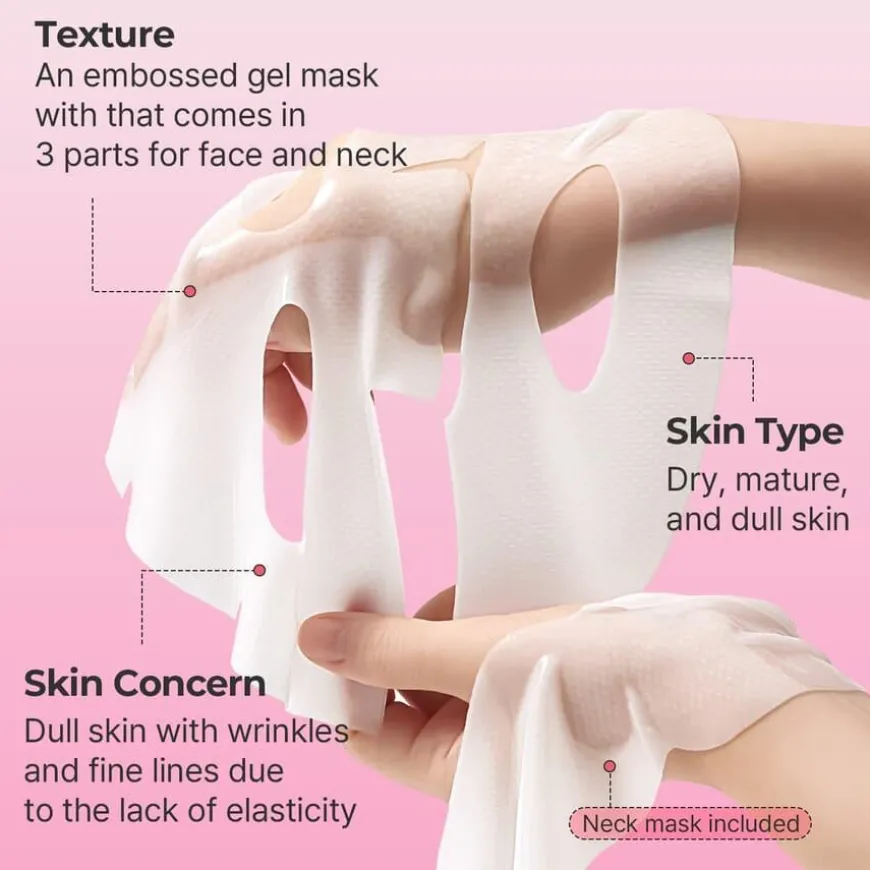 - 1. Etter rens, plasser den mønstrede siden av gelmasken på ansiktet og halsen.