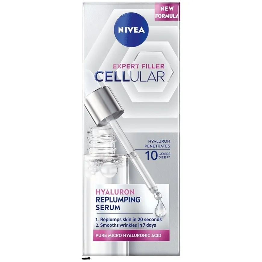 NIVEA Cellular Expert Filler Hyaluron Replumping Serum er et serum som gir intensiv fuktighet og en synlig fyldigere hud. Beriket med ren mikrohyaluronsyre, et fuktighetsbindende molekyl som naturlig finnes i huden, hjelper serumet med å jevne ut rynker og forbedre hudens elastisitet. De ultrafine molekylene er 40 ganger mindre enn makrohyaluronsyre, noe som gjør at de trenger 10 lag dypt inn i huden for en effektiv rynkefyllende effekt. Den lette formelen absorberes umiddelbart uten å føles klissete, og etterlater huden myk, hydrert og mer ungdommelig. Passer for alle hudtyper, inkludert sensitiv hud, og er dermatologisk testet.