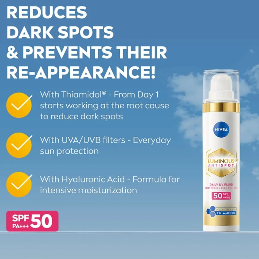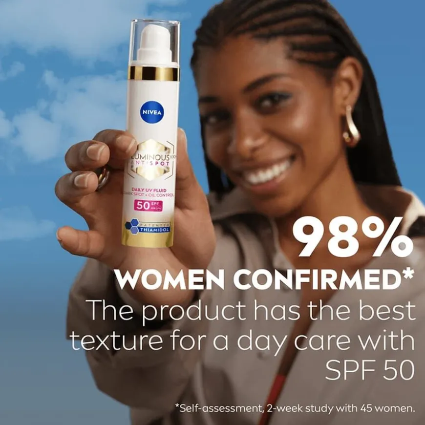 Cellular Luminous630 Anti Dark Spot Day Fluid inneholder den pigmentflekk-dempende, ingrediensen LUMINOUS630, som kombineres med en ekstra beskyttende, men samtidig lett formel beriket med celleaktiverende hyaluronsyre*, vitamin E og UVA/UVB-filter (SPF 50). Det tok forskerne hos NIVEA ti år med intensiv forskning og screening av 50 000 ingredienser for å finne LUMINOUS630, som virker effektivt på cellenivå. Dermatologisk testet. Skånsom mot huden og egnet til alle hudtyper, også sensitiv hud.