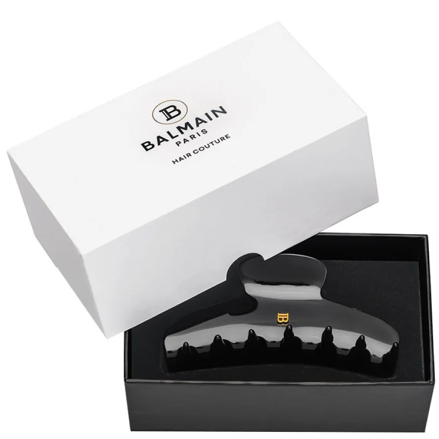 Cellulose Acetate Pince À Cheveux Large Hairclip er enstor håndlaget klo-klips laget av slitesterk celluloseacetat designet med Balmains signatur 18K gullbelagte «B» -logo. Det ekstremt sterke, men fleksible materialet er allergivennlig og skånsomt for hår og hodebunn. Den store klipsen er spesielt designet for tykt og langt hår og fungerer som et ekte statementstykke når det klippes inn i håret.