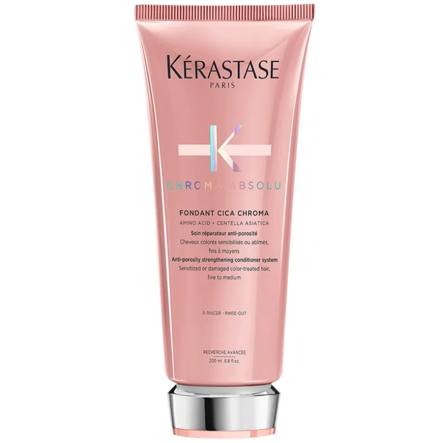 Kérastase Fondant Cica Chroma Conditioner er en kraftfull reparerende balsam mot porøst hår, for sensibilisert eller skadet, fargebehandlet hår, hovedsakelig tilpasset tynt til middels tykt hår. Denne lette, lyserosa kremen, beriket med aminosyre og Centella Asiatica, er i stand til å trenge inn i hårets kjerne for å fylle porøsit hår, fukte og styrke håret innenfra, som hjelper fargen med å vare lenger. Trenger inn til kjernen av håret og gir 86 % sterkere hårstrå*. 92% av fargens intensitet er bevart etter 6 uker**. **Instrumentelle tester: Bain Chroma Respect + Fondant Cica Chroma.