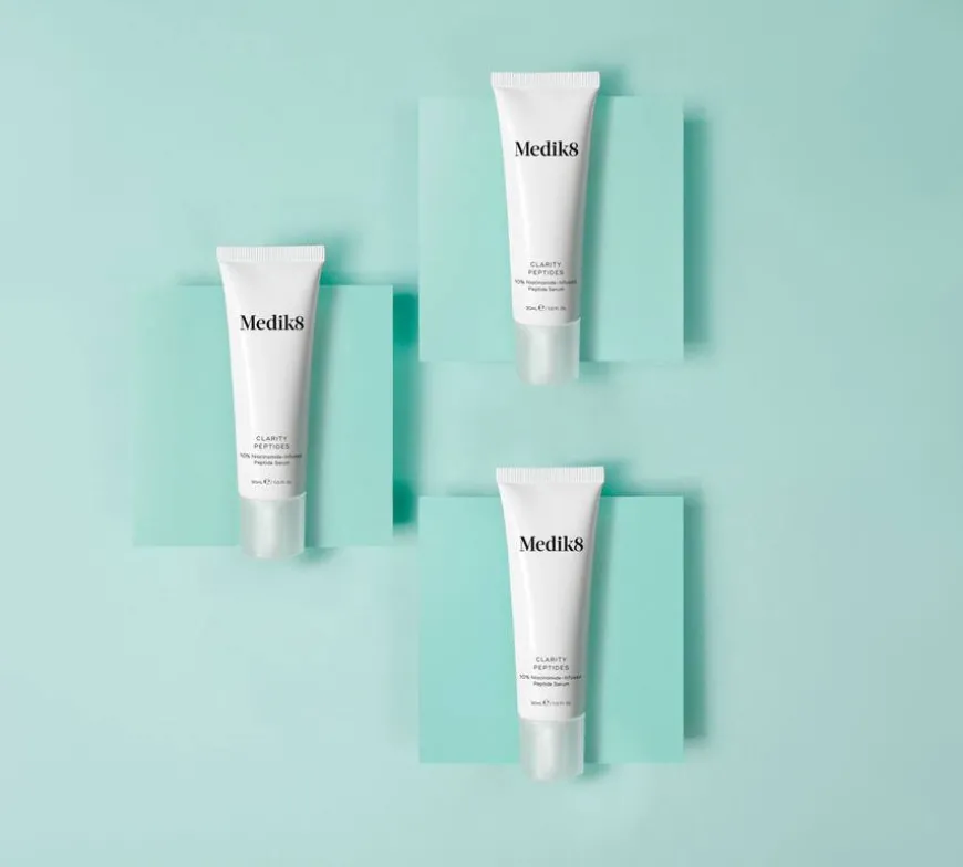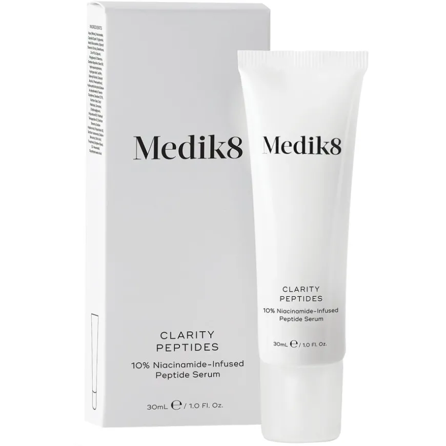 Clarity Peptides er et hurtigabsorberende peptidserum med 10 % niacinamid for alle som vil oppnå krystallklar hud. Medik8 har utformet et unikt leveringssystem for å sikre at peptidene effektivt når dit de trengs mest. Oppdag produktet som gir glød, lyser opp og beroliger. Det bekjemper ganske enkelt den effekten som stress, dårlig kosthold, hormonelle endringer og søvnmangel kan ha på huden. Inneholder dessuten Crystalide™ peptid som bidrar til en jevn og reflekterende hudtone og fremmer hudens naturlige klarhet. Inneholder sink-PCA for å styrke hudcellenes naturlige forsvarsmekanismer. Angriper også bakterier som forårsaker kviser, for en feilfri og klar hud.