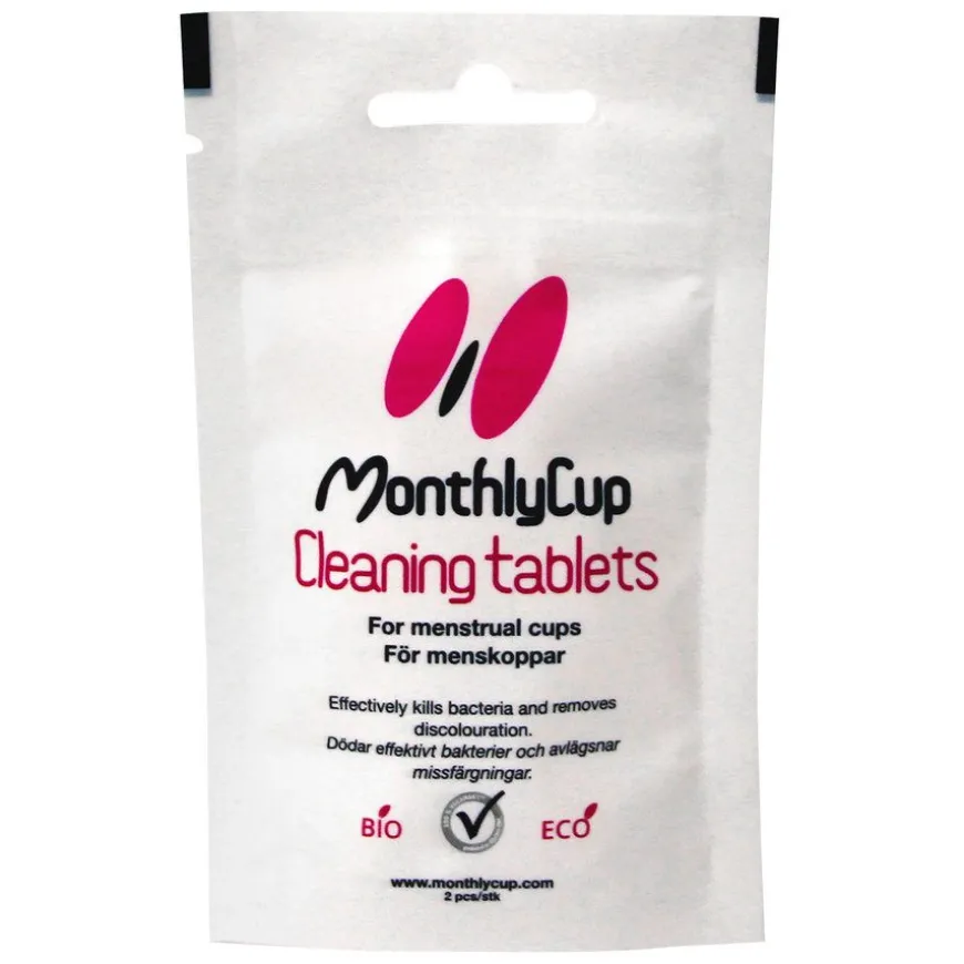 MonthlyCup Cleaning Tablets er effektiv og vennlig rengjøring for din menskopp. Disse tablettene dreper effektivt bakterier, fjerner misfarging og er i tillegg laget av naturlige ingredienser, biologisk nedbrytbart og miljøvennlig. Det finnes ikke noe lignende på markedet som effektivt dreper bakterier og fjerner misfarginger som disse tablettene. Tablettene er laget i Sverige.