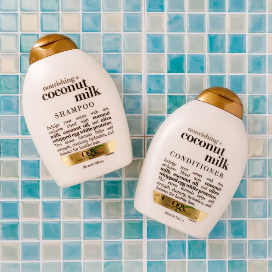 Ogx Coconut Milk hårpleieserie gir næring til håret – fra hodebunn og hårrøtter til helt ytterst i hårtuppene! Spesielt egnet til tørt og livløst hår. Blandingen av melk fra kokosnøtt, proteiner fra eggehvite og den tørre, vektløse kokosnøttoljen, fremmer hårets naturlige styrke, elastisitet og fuktighet – og gir en tropisk glans til håret. Ogx Coconut Milk Shampoo gir en fantastisk ren, frisk og eksklusiv følelse til håret. Shampooen gjenoppretter hårets balanse.